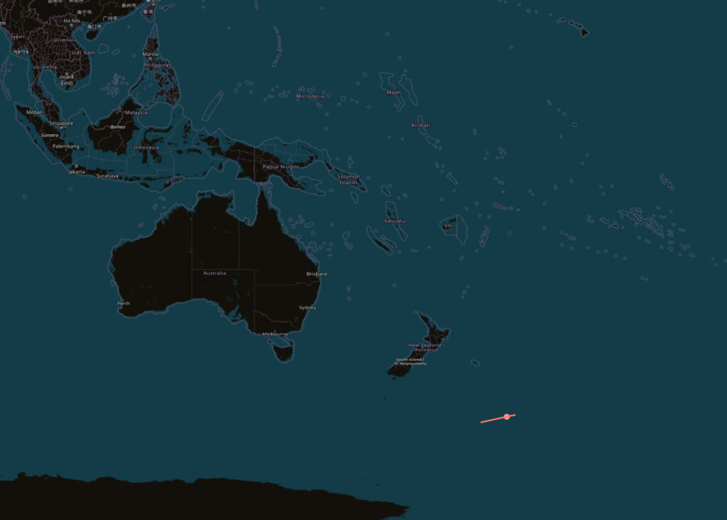 Kohde on saapunut Maan ilmakehään Uuden-Seelannin kaakkoispuolella sijaitsevalle merialueelle. Space-Trackin ennusteen epävarmuus on vain ±1 minuutti, joten tätä voidaan pitää putoamisalueen lopullisena arviona.