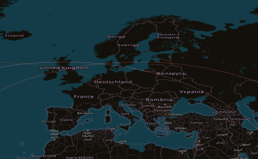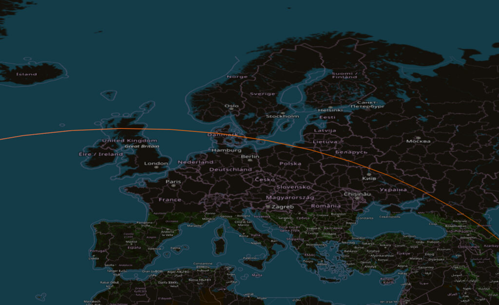 Ohessa näkyvät kohteen kiertoradat (katkoviivoin), jotka kulkevat Euroopan alueen poikki. Kuvakaappaus on kansallisen Avaruustilannekeskuksen seurantajärjestelmästä. EU STT ei ole ilmoittanut seuraavan ennusteen ajankohtaa, mutta Avaruustilannekeskus seuraa tilannetta ja päivittää uudet ennusteet tämän uutisen yhteyteen, mikäli niitä julkaistaan.